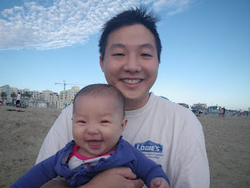Well, two weekends ago, cousin Connie invited us to join them at the Santa Monica Pier and I 'm glad she did.  We had a lot of fun and it was Caitlin's first time at the beach!  And the best part was, Caitlin patiently sat through lunch and made it to the beach and back without flipping out hysterically.  In fact, quite the opposite, as she was full of squeals and smiles the entire time.  Caitlin also didn't ask to eat, which was great since I don't really know how to breastfeed when it's not done in my bed.