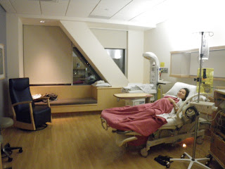At 1:00am, we moved to my private birthing suite, which was equipped with goodies such as a flat screen TV, a couch/bench/bed-thing for the dad-to-be, a rocking/glider chair, and a bathroom. Of course, I wasn't in the mood to take advantage of any of the amenities.